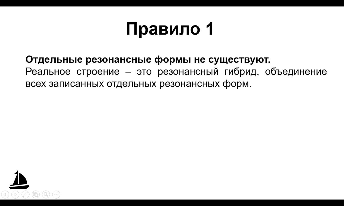 Этих правил 5 Первое - это то, что резонансные формы - это не то, что есть на самом деле, а то, что нашим мозгам под силу нарисовать, изобразить. Второе - это то, что резонансные формы отличаются лишь пи-связями и неподеленными парами электронов. Все остальное, включая расположение атомов и сигма-связей неизменно. Если в примере выше Вы заметили, что две резонансные структуры оказались эквивалентными друг другу, то это не всегда бывает так. Третье - о том, что резонансные структуры не обязаны быть эквивалентными. Четвертое - о том, что правила валентностей никто не отменял. При записи структур стоит помнить о правиле октета. И пятое, то самое, ради чего мы и рисует резонансные структуры - чем больше резонансных структур в веществе, тем оно стабильнее.