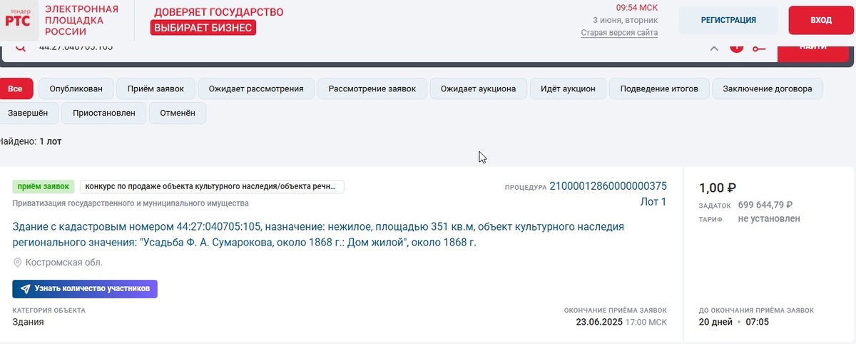 Заявки на участие принимаются до 23 июня этого года Усадьбу Сумарокова в Костроме выставили на торги за рубль в рамках приватизации госимущества. Объявление опубликовали на электронной площадке «РТС-тендер». Скриншот объявления на электронной площадке «РТС-тендер» Исторический архитектурный комплекс ранее принадлежал князьям Сумароковым. Само здание является образцом классической усадьбы, состоит из двух деревянных жилых домиков и хозяйственных построек. После Сумарокова усадьба успела побывать во владении поверенного Валынского и начальницы семинарии Херсонской. Источник фото: группа ВК «Кострома. Взгляды наших предков» Объект культурного наследия регионального значения находится на Лермонтова, 10а. Усадьба отражает историю и быт российской аристократии XVIII–XIX веков. Строение требует капитального ремонта, площадь составляет 351 квадратный метр. Будущий собственник будет обязан отреставрировать здания. Рубль — начальная цена. Заявки на участие в торгах принимаются до 23 июня этого