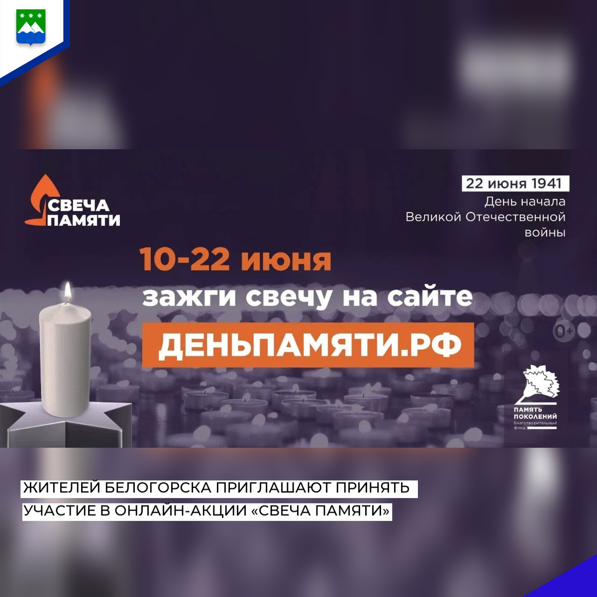Белогорцы могут зажечь «Свечу памяти». 10 июня по всей России стартует онлайн-акция «Свеча памяти». До 22 июня на сайте деньпамяти.рф каждый может зажечь свою виртуальную свечу и почтить память героев Великой Отечественной войны. 22 июня, 84 года назад, стало действительно «чёрным» в истории страны: начало Великой Отечественной войны. Она унесла 27 млн жизней. Онлайн-акция «Свеча памяти» была организована благотворительным фондом «Память поколений». На платформе деньпамяти.рф можно не только зажечь виртуальную свечу, которая тут же отобразится на счетчике, но и посмотреть видеоинтервью ветеранов Отечественной войны. Более 60 роликов с воспоминаниями о войне от первого лица: фронтовиков, блокадников, тружеников тыла, узников концлагерей – бесценное наследие, которое благотворительный фонд «Память поколений» собирал по крупицам по всей России.