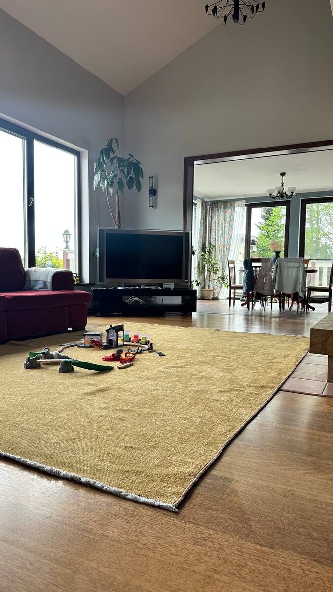Добрый день! Сегодня показываю ковры, которые я выбрала в наш загородный дом. Лот N1. Безворсовый ковер Tokyo 1083-62823 (240*340 см) https://amikovry.ru/catalog/product/bezvorsovyy-kover-tokyo-1083-62823/?offer=322731 Это двухсторонний ковер с плюсами и минусами. ➕ у него 2 принта/цвета, при желании можно перевернуть и обновить визуально интерьер. ➖ так как обе стороны являются лицевыми, то он не фиксируется на полу и «живет своей жизнью» или жизнью Мирославы в нашем случае 😁 Но это можно исправить, купив подложку под ковер или липучие фиксаторы для ковров. Мы пока оставили как есть, нас это не напрягает. Он как большое плотное покрывало. Состав: 80% хлопка, 20% полиэстер шенилл. Очень мягкий, по нему приятно ходить босиком и все активности теперь у нас в каминном зале на этом ковре. Цвет подбирала к дивану и общему настроению. Полы достаточно темные, хотелось светлее, теплее и ярче оттенков для хорошего, солнечного настроения. И мне это удалось! Муж, конечно, не рад был незаплани
