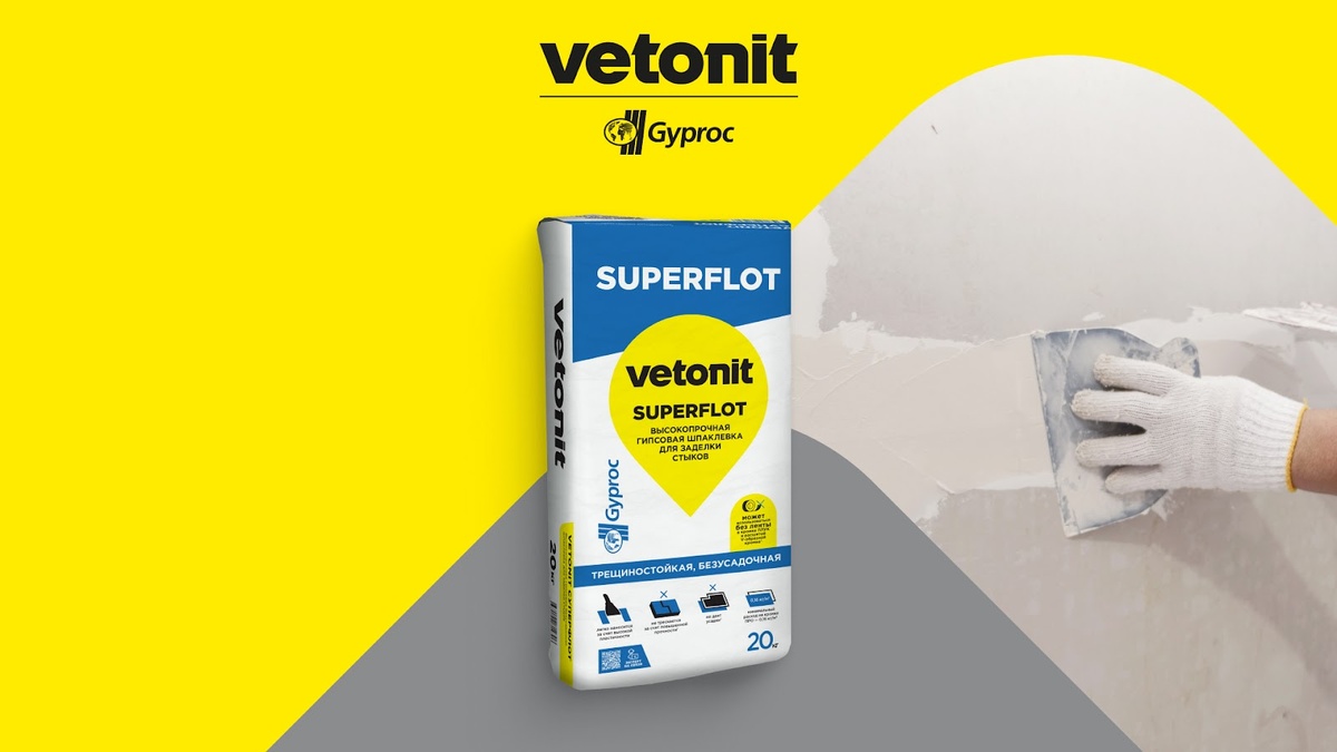Vetonit (Gyproc) SUPERFLOT — это высокопрочная безусадочная гипсовая шпаклевка, разработанная для заделки стыков гипсовых строительных плит (ГСП) и других видов гипсокартонных листов (ГКЛ). И ее возможности не ограничиваются только этим.