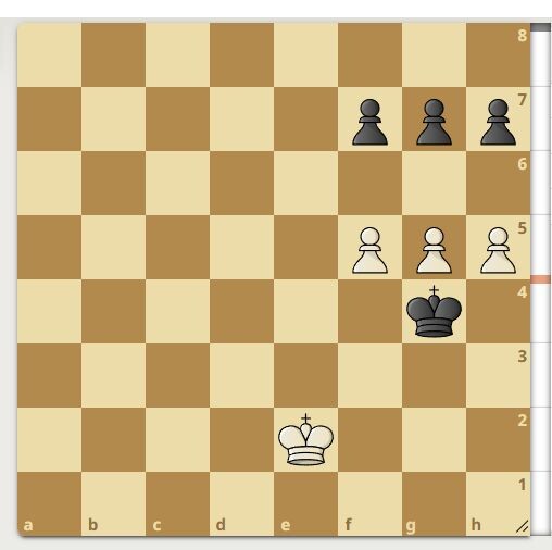 У белых три пешки, и у черных три пешки. Однако черный король подошел вплотную к пешкам белых. Интересная шахматная задача тут >>>> Выигрыш смотрите далее. 1. Белые двигают вперед пешку на "g6". 1. ........................ черные бьют пешкой "f" на "g6". 2. Белые двигают пешку на "h6". 2. .................. черные бьют пешкой на "h6". 3. Белые проводят ферзя по линии "f". Подписывайтесь на канал.