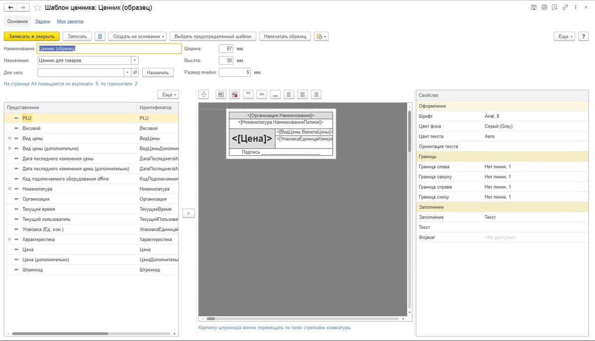 3️⃣В списке шаблонов приступаем к созданию шаблонов этикеток и ценников по кнопке «Создать» открывается окно помощника настройки, в котором выбираем размер, назначение и произвольное наименование (в нижней части формы отображается вид шаблона);