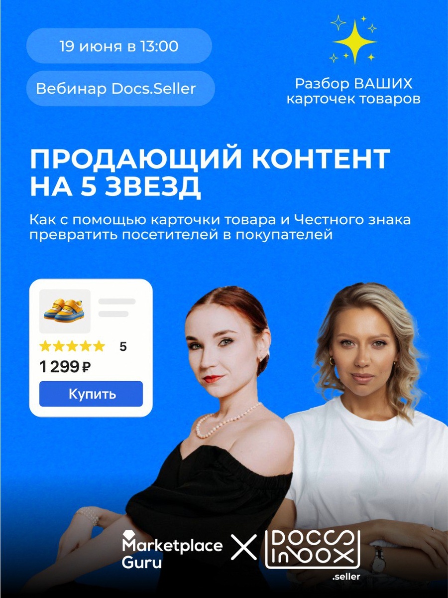 🔥 ВЕБИНАР, ПОСЛЕ КОТОРОГО ХОЧЕТСЯ ПЕРЕДЕЛАТЬ ВСЕ КАРТОЧКИ ТОВАРА Продающий контент на 5 звезд Как с помощью карточки товара и «Честного знака» превратить посетителей в покупателей Если вы... –Получаете трафик, но он не конвертится –Делаете «красивые» карточки, а продаж всё так же мало –Думаете, что «Честный знак» — это просто про маркировку –Понимаете, что нужно улучшать контент, но не знаете, с чего начать ➡️ Тогда вам точно к нам. 📆 Дата и время: 19 июня, 13:00 по МСК 🎟 Регистрация открыта