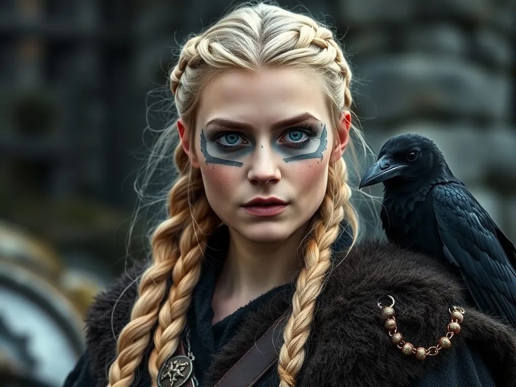A photograph of an attractive young woman with long blonde hair braided in a braid, blue eyes and black battle paint on her face. She is dressed in a Viking costume with a black raven on her shoulder, The style should be realistic but with elements of fantasy and magic