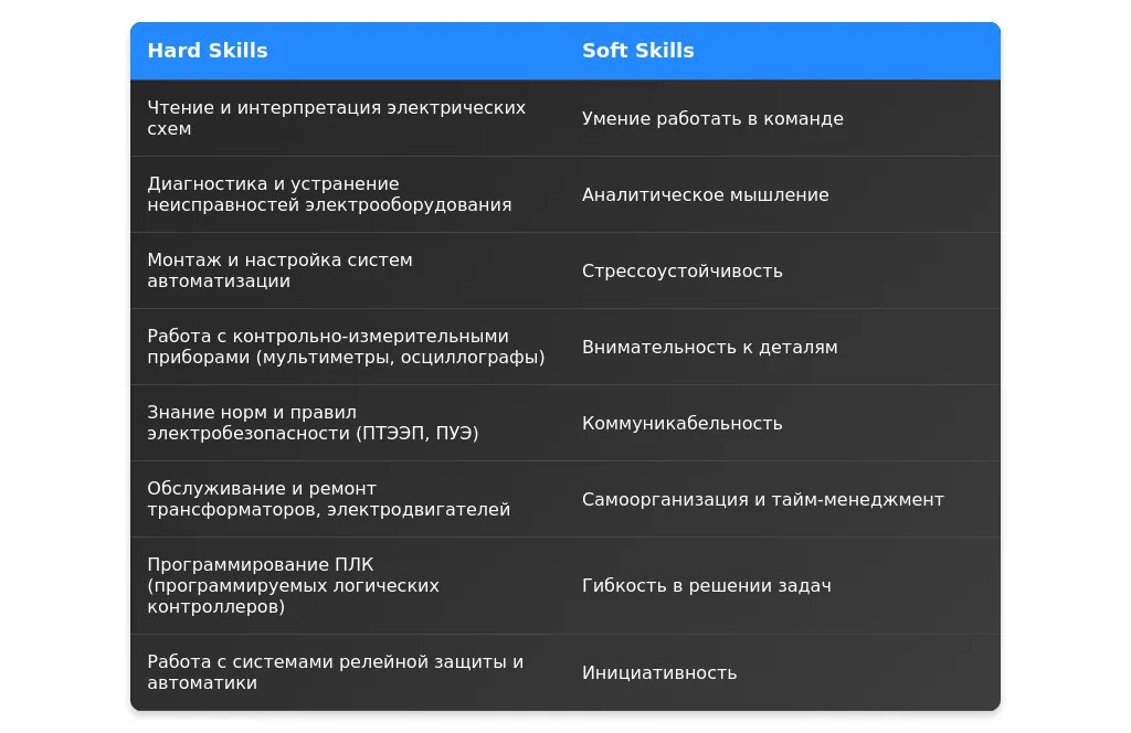 Soft skills — это личные качества, которые помогают эффективно работать в команде и решать задачи. Вот топ-10 важных качеств для электромонтера: