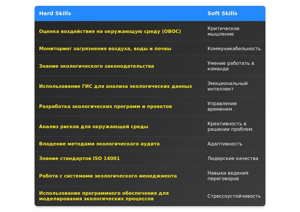 После адаптации: "Знание экологического законодательства, опыт подготовки отчетности и взаимодействия с государственными органами, работа с программным обеспечением для экологического мониторинга."