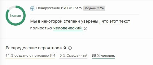 В продолжение темы использования ИИ и "никто ничего не заметит" Есть сервисы, которые определяют, написан ли текст Человеком или ИИ: https://gptzero.me/ - один из них. Бесплатный до 5000 знаков. На скрине - результат сканирования этого поста. Писала текст сама, без правок. В том числе для чистоты эксперимента. Видим, что сервис работает с погрешностью (результат должен быть 100%). И всё же работает. Выводы? Использовать ИИ в меру, чтобы не терять авторства, ведь оно всё больше и больше будет цениться. Такими сервисами будут пользоваться всё чаще, в том числе для проверки статей, маркировки постов, написанных ИИ и прочее. Возможно и вам он будет полезен. Полезный сервис для поверки текстов на ИИ для вас? ❤️ - да, не знал/знала про них! 👍 - уже использую такие проверки 🤝 - не пользуюсь ИИ #ии, #проверка_на_ии, #сервис_для_проверки_текста