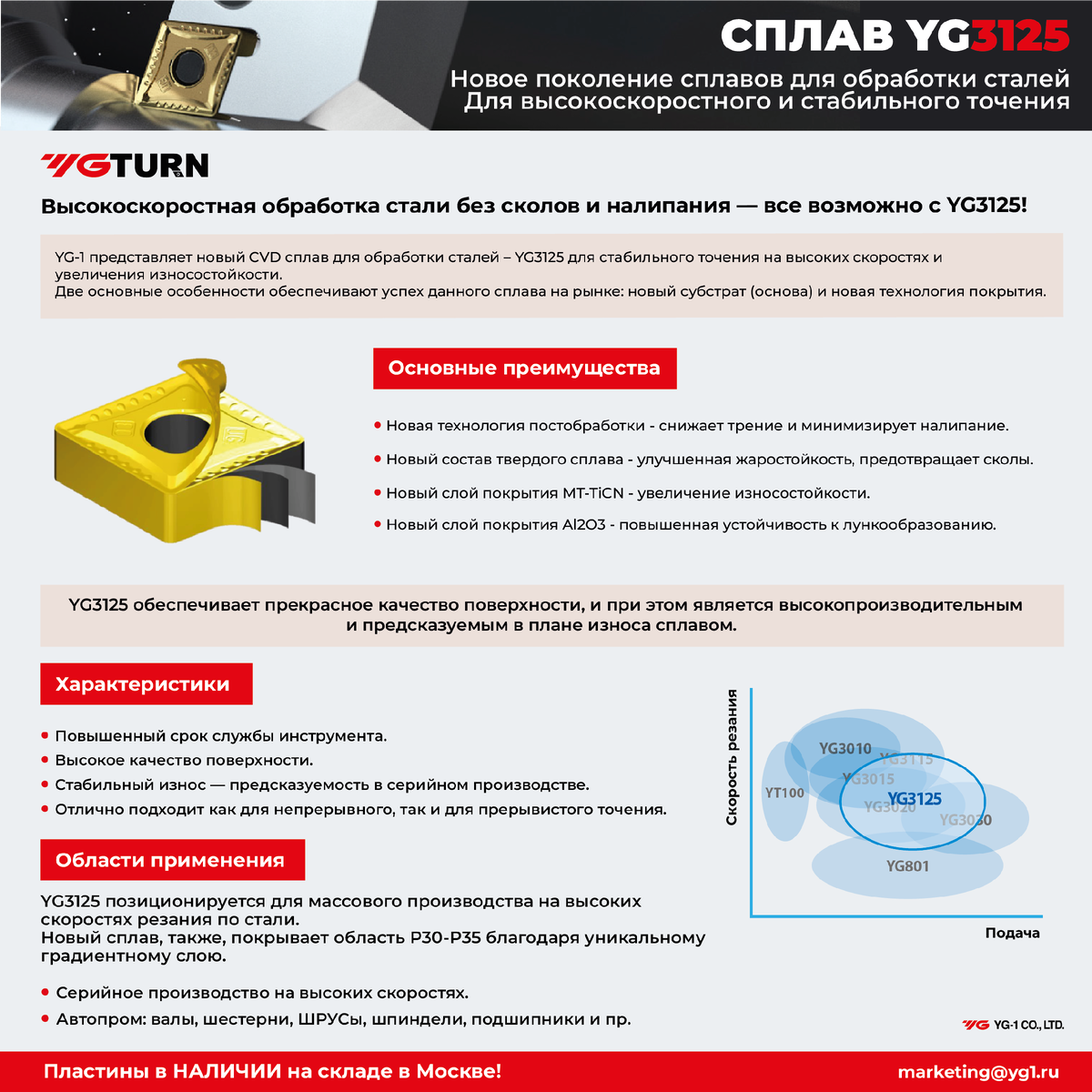 Работаете со сталью и ищете решение, которое выдержит нагрузки, обеспечит стабильное качество и при этом будет работать долго? Знакомьтесь — YG3125 от компании YG-1, уже доступен на складе в Москве. YG3125 — это новый токарный сплав с покрытием CVD, созданный специально для обработки разных типов стали (от P15 до P35). Он подойдёт как для непрерывной обработки, так и для прерывистой, включая детали после термообработки. ✅ Долгий срок службы