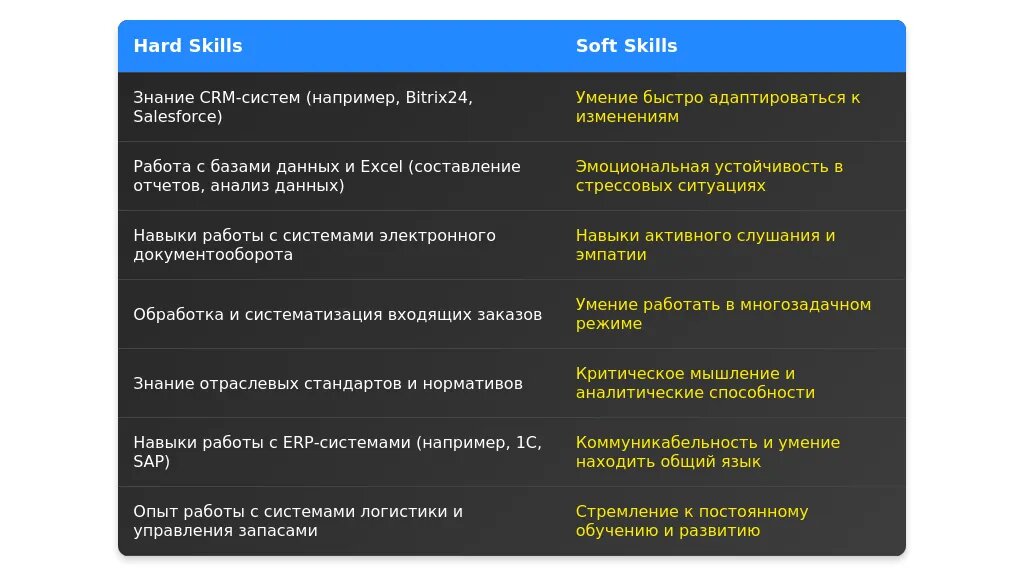 После: "Навыки работы с клиентами, знание CRM-систем, ведение документации, стрессоустойчивость."