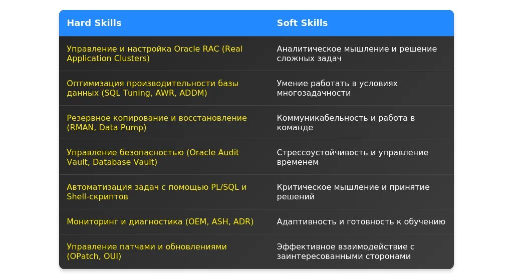 - Баланс навыков: Сочетайте узкоспециализированные навыки (например, Oracle RAC) с общими (например, управление проектами).