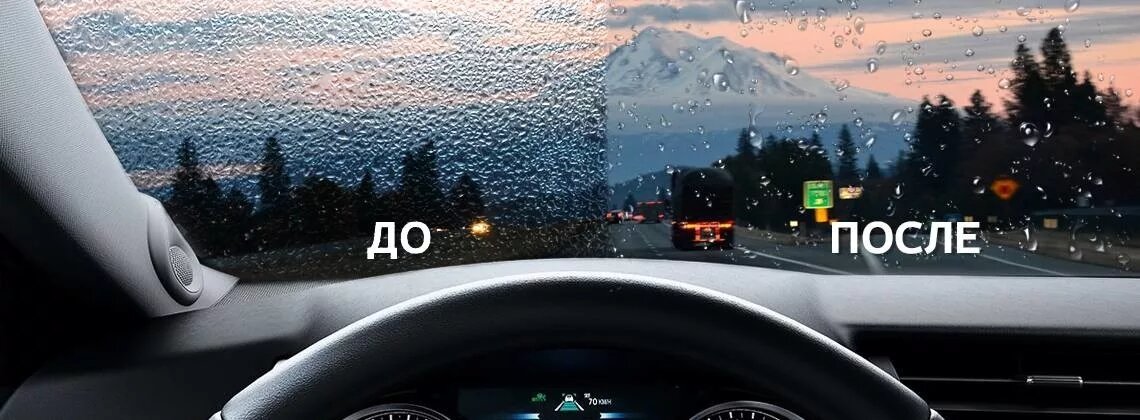 Мы рекомендуем профессиональное покрытие «Антидождь» на лобовое, боковые стекла и зеркала: