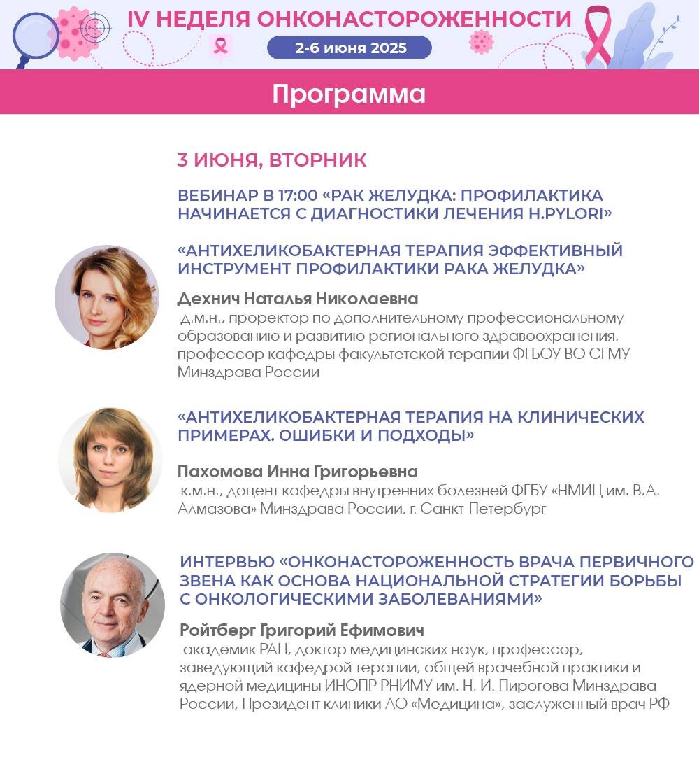 🏆Возможно ли победить рак? Сегодня в программе Недели Онконастороженности: 🔺Вебинар в 17:00 «Рак желудка: профилактика начинается с диагностики и лечения H.pylori» Об эрадикации H.pylori как о профилактике рака желудка, а также разбор типичных ошибок антихеликобактерной терапии Дехнич Наталья Николаевна д.м.н., проректор по дополнительному проф. образованию, проф. кафедры факультетской терапии ФГБОУ ВО СГМУ Минздрава России Пахомова Инна Григорьевна, к.м.н., доцент НМИЦ им. В.А. Алмазова (СПб) 🔺Интервью «Онконастороженность врача первичного звена как основа национальной стратегии борьбы с онкозаболеваниями» Рак можно победить. Почему онконастороженность – ключ к успеху? Делится своим мнением и опытом Ройтберг Григорий Ефимович, академик РАН, доктор медицинских наук, профессор, заведующий кафедрой терапии, общей врачебной практики и ядерной медицины ИНОПР РНИМУ им. Н. И. Пирогова Минздрава России, Президент клиники АО «Медицина», заслуженный врач РФ. Страница Недели Онконаст