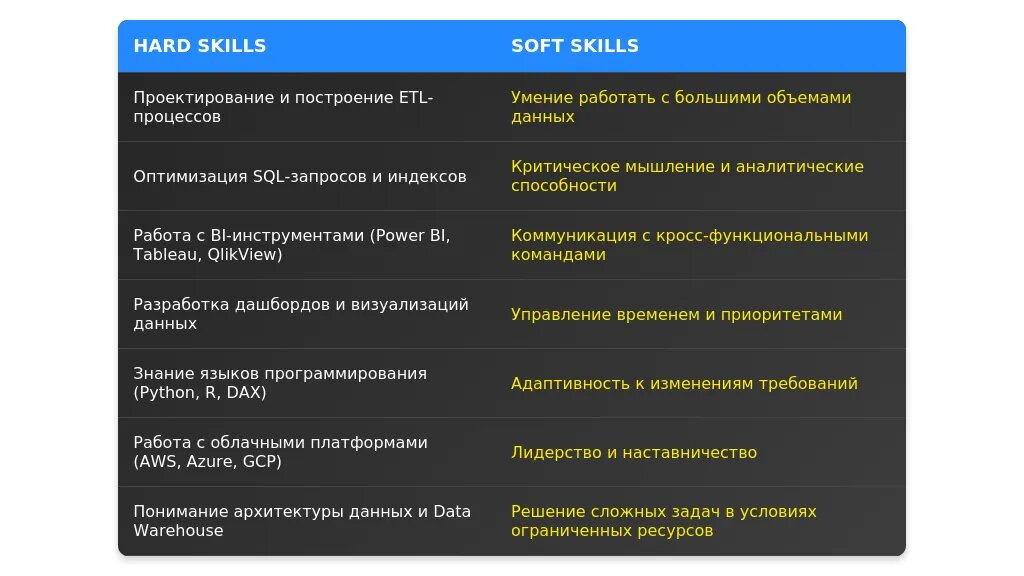 После: Анализ больших данных, создание дашбордов, оптимизация SQL-запросов, работа с облачными платформами (AWS, Azure).