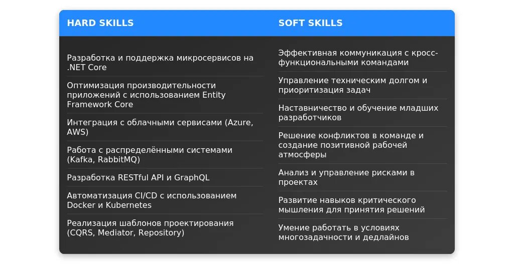 Пример 1: Вакансия требует опыт работы с .NET Core и микросервисами. Обратите внимание на фразу "опыт работы в Agile-командах" — это скрытое требование к навыкам командной работы.