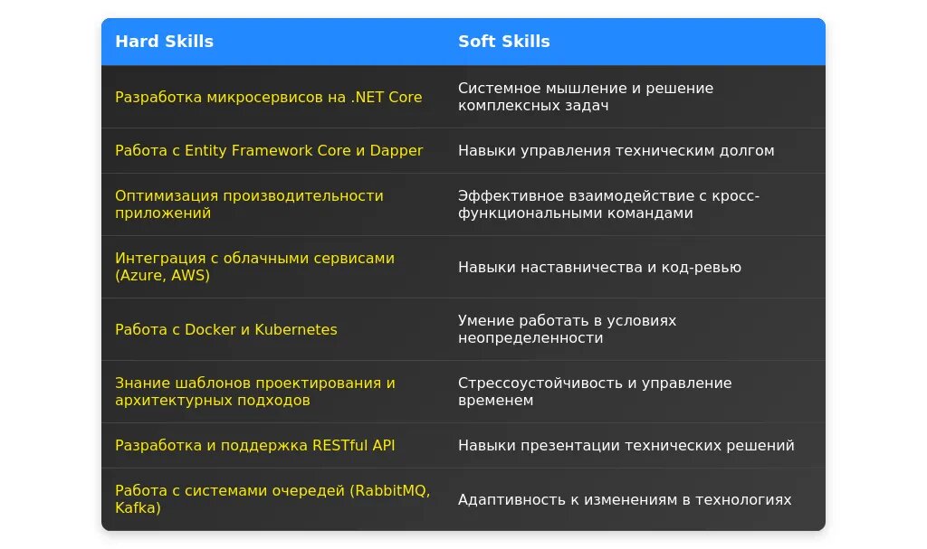 При анализе вакансии для старшего разработчика .NET важно выделить ключевые требования. В первую очередь, обращайте внимание на обязательные требования, такие как опыт работы с .NET Core, знание C#, SQL и опыт работы с базами данных. Желательные требования, такие как опыт работы с Docker, Kubernetes или микросервисной архитектурой, также важны, но могут варьироваться в зависимости от компании.