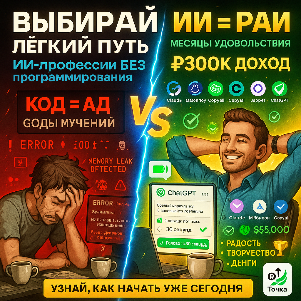 Большинство людей думают, что нужно учить Python и писать алгоритмы, чтобы работать с ИИ. Они тратят месяцы на изучение программирования, пока умные уже зарабатывают ₽200-500k, используя готовые ИИ-инструменты. Ты ведь тоже чувствовал, что кодинг — это не твоё? Отлично, потому что есть способ лучше.