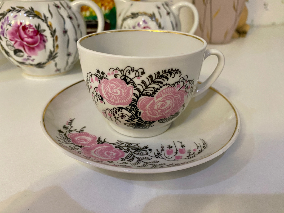 У самурая нет цели - есть только путь. Ходить на барахолку при каждой удобной возможности - это стиль жизни, если хотите. Я перманентно нахожусь в поиске чего-либо. Например, могу годами искать половинки для чайных пар😁 Я серьезно говорю, не смейтесь - блюдец не видать ни на блошках, ни на авито. Возможно, к моменту покупки (если такое вообще случится) они из винтажных перейдут в разряд антикварных. Совсем другое дело, когда ты на ровном месте взял и оказался счастливым обладателем чайной пары. А если ты еще эти пары и коллекционируешь, это вдвойне приятно. А если тебе нужна была именно такая пара, то вообще втройне. Эти графичные розы от ЛФЗ - подарок моей читательницы. Рисунок очень похож на ручную роспись, но это деколь на самом деле. Как-будто художник взял тонкое перо и зашифровал послание среди ботанических переплетений. Хочется рассматривать. Я даже птицу увидела на чашке внизу рисунка😁 Названия его, увы, не нашла. Хотя 10-ая группа сложности на клейме настойчиво утверждает,