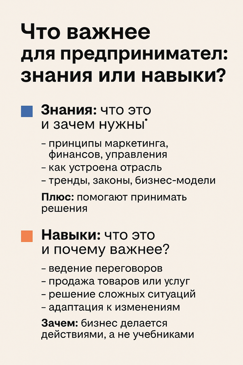 Этот вопрос волнует многих — как тех, кто только задумывается о запуске своего дела, так и опытных бизнесменов. Попробуем разобрать его по полочкам. Знания — это теория. Это информация, которую человек получает через книги, курсы, обучение, наблюдение за рынком и чужим опытом. Навыки — это практика. Это то, что человек реально умеет делать своими руками или через управление людьми. Навыки часто формируются через опыт, ошибки, пробы и реальные проекты. На старте Базовые знания (продажи, финансы) Ключевые навыки (переговоры, действие) При ростеУглублённые знания (менеджмент, аналитика) Лидерство, управление командой В кризисахПомогают анализировать ситуациюСпасают: адаптация, решимость, импровизация Если выбирать только одно — важнее навыки.