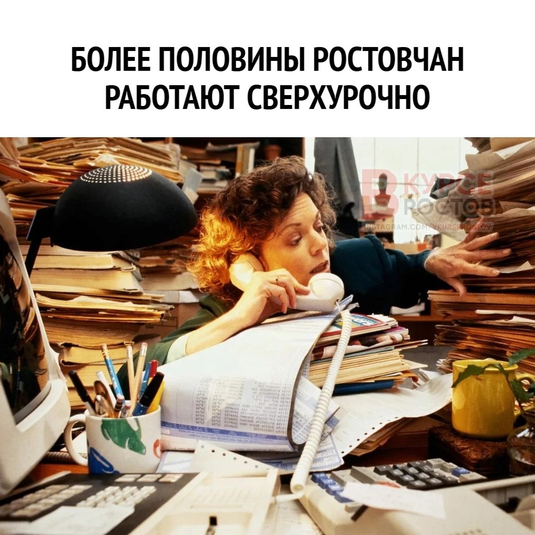 По данным SuperJob, 56% работающего населения Ростова-на-Дону трудится сверхурочно, увеличивая рабочие часы в среднем на четверть от нормы. Чаще перерабатывают мужчины и молодежь (до 35 лет). Курьеры, логисты, маркетологи, фармацевты и экономисты чаще работают сверхурочно, чем операторы колл-центров и юристы. Больше всего дополнительных часов у врачей и учителей.