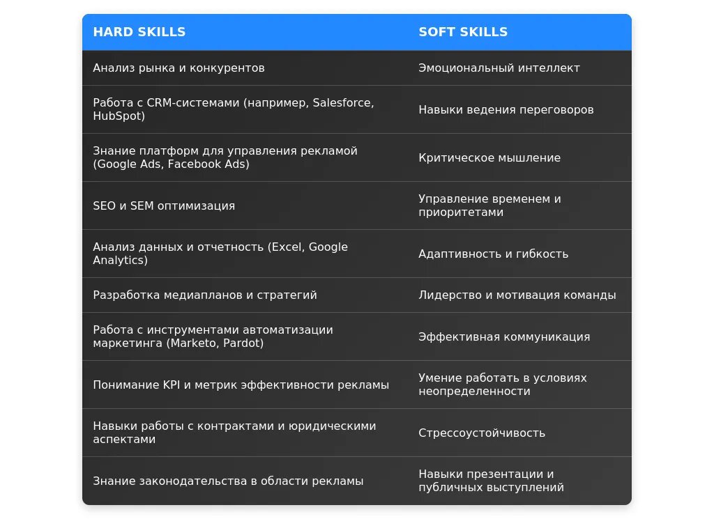 После: "Навыки ведения переговоров, работа с CRM-системами (Bitrix24, Salesforce), аналитика рекламных кампаний."