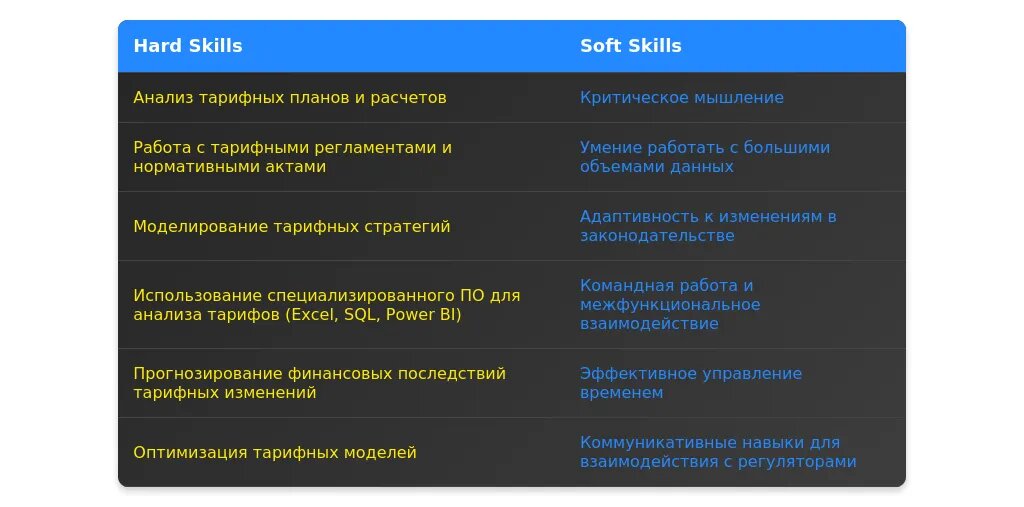 - Ключевые навыки (анализ данных, расчет тарифов, работа с нормативными актами).