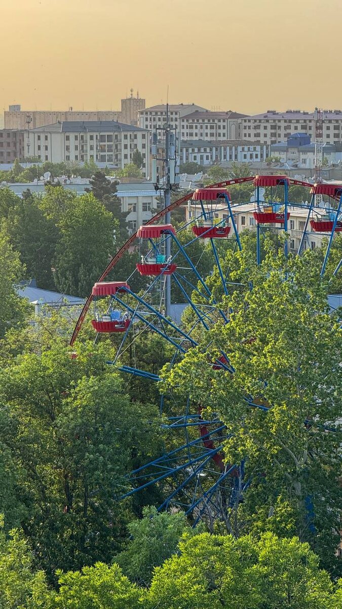 Узбекистан. Самарканд После посещения Шахи-Зинда мы отправились на обед и затем направились в сторону железнодорожного вокзала. По пути оказались в парке аттракционов — не упустили шанс прокатиться на колесе обозрения и ещё на одном захватывающем аттракционе. Вообще, я поставил себе цель — кататься на каждом колесе обозрения, которое встречаю. В Узбекистане я побывал во всех доступных парках и везде прокатился. Эту традицию я продолжил и дома: прокатился на колесе в Тольятти (дважды!), в Ульяновске, в Казани — и останавливаться не собираюсь. Позже мы добрались до вокзала, где за 150 000 сумм апгрейдили билеты с обычных мест до бизнес-класса. В проветриваемом, комфортном вагоне я посмотрел фильм «Мой парень — псих» и немного поспал. Уже ночью прибыли в Ташкент.