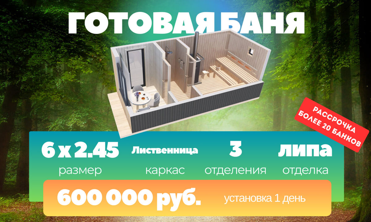 Продается ТОПОВАЯ баня в люкс исполнении! Это не типовое решение, а воплощение мечты для взыскательных ценителей. ✨ Почему это ЭКСКЛЮЗИВ? ✨ ➡️ МГНОВЕННОЕ ОБЛАДАНИЕ РОСКОШЬЮ: * Увидели? Понравилось? * Уже завтра – она украшает ВАШ участок! * Через 60 минут после установки – наслаждаетесь первоклассным паром! Погружение в жар → Освежение в ледяной воде → Новый заход в ароматную парную. Идеальный цикл релакса! 💎 ПРЕМИУМ-КОМПЛЕКТАЦИЯ (то, что отличает ТОП): • Интеллектуальная печь: Мощная, экономичная, создающая ИДЕАЛЬНЫЙ пар. • Элегантные стеклянные двери: Впускают свет, подчеркивают стиль. • Каркас из благородной ЛИСТВЕННИЦЫ: Прочность, долговечность, неповторимый аромат и статус. • ИННОВАЦИОННАЯ СИСТЕМА ПОЛОВ: - Парилка/Моечная: Профессиональные *промываемые и обслуживаемые* полы – безупречная гигиена. - Инфракрасный подогрев + Кварцвинил: Роскошное, вечное тепло под ногами и элитное покрытие. ⏱️ Мечтать о топовой бане – прекрасно. Париться в ней ЗАВТРА – реально! ⏱️ ➡️ Забронируйте с