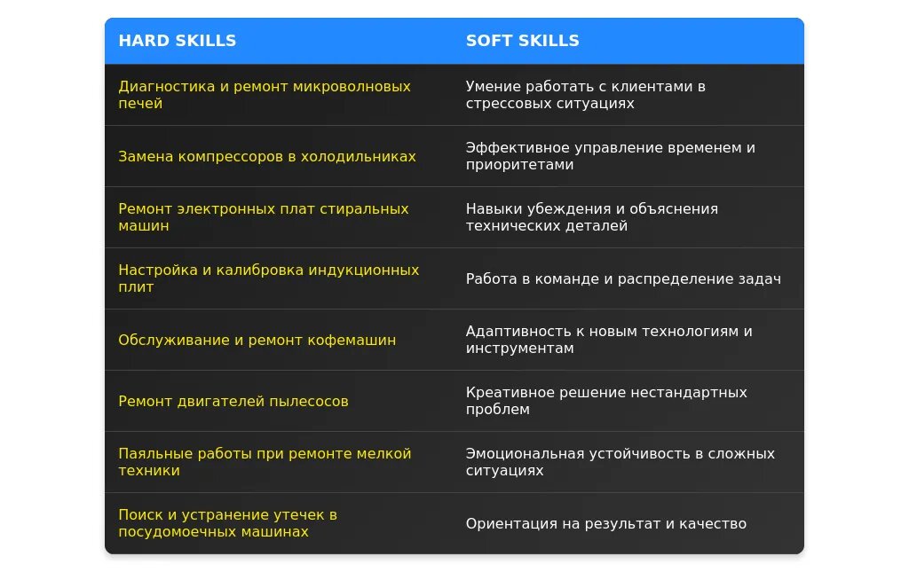 Обязательные навыки для мастера по ремонту бытовой техники включают: