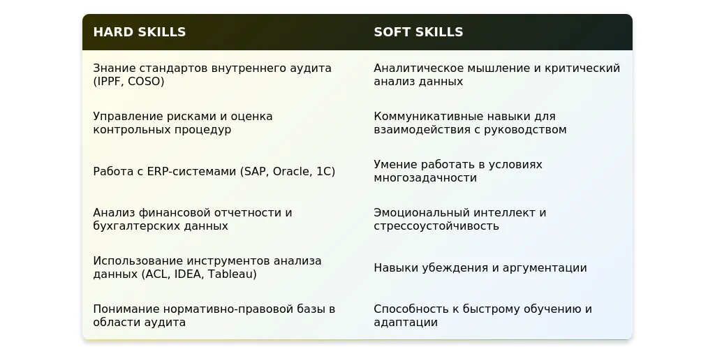 - Знание стандартов COSO и IIA (актуально для 2025 года).