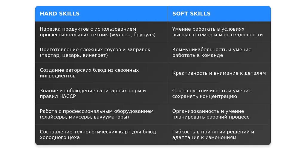 Soft skills — это личные качества, которые помогают эффективно работать в команде и справляться с задачами. Для повара холодного цеха важны: