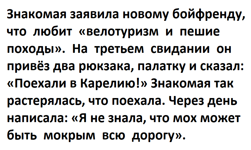 На дне рождения друга я зачем-то сказала, что умею играть на гитаре. Через полчаса меня вытащили к костру и протянули инструмент. Я знала только один аккорд — играла его до посинения, напевая что-то между «Муркой» и мантрой. Никто не понял, что это был позор. Все подумали — артхаус. 3.