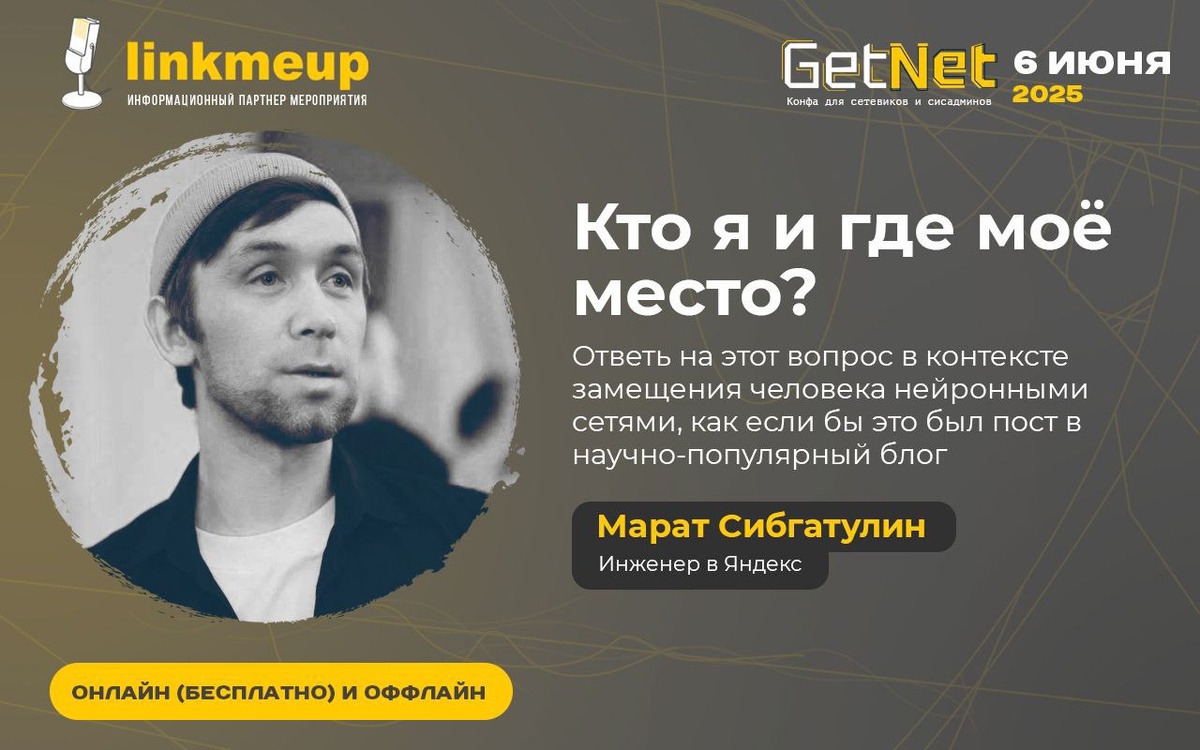 6 июня всё ближе, а вместе с ним и GetNet. Среди спикеров замечен Всё-ещё-инженер из Яндекса, некий Марат Сибгатулин, с рассуждениями и рефлексией вокруг замещения человека инженерного нейросетями.