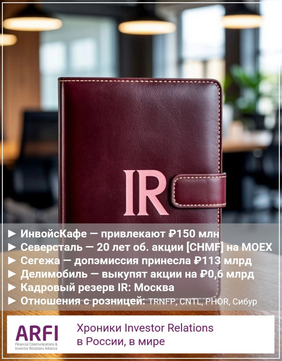 Утренний IR-дайджест 03.06.2025 ► ИнвойсКафе [IPO-2028?] — инвест-платформа привлекает в капитал ₽150 млн, за долю 16,5%, при постинвестиционной оценке компании в ₽910 млн. • Платформа ИнвойсКафе объединяет частных инвесторов и представителей малого и среднего бизнеса, предлагая им инструменты для получения и выдачи займов, страхования инвестиций и размещения облигаций. Отличительные особенности сервиса — надежность операций для всех участников, скорость предоставления услуг для бизнеса, высокий уровень качества продуктов и клиентского сервиса. • По состоянию на весну 2025 года платформой ИнвойсКафе пользуются более 2 500 инвесторов. Ожидаемый суммарный объем заключенных на платформе сделок по итогам 2025 года составит ₽2,7 млрд, при этом выручка компании увеличится до ₽185 млн. • BITL — организаторы раунда инвестиций. • Сделка пройдет на инвестиционной платформе «ВТБ-Регистратор». • IPO компания планирует провести в 2028 году (смещение на 3 года). ► Северсталь [CHMF] — 2 июня исполн
