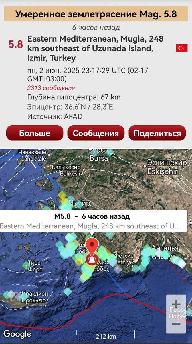 В ответ на пост Согласно предупреждению от 30 мая произошло землетрясение М5.8 между Додеканес и Турцией. ===== According to the warning issued on May 30, an M5.8 earthquake struck between the Dodecanese and Turkey.