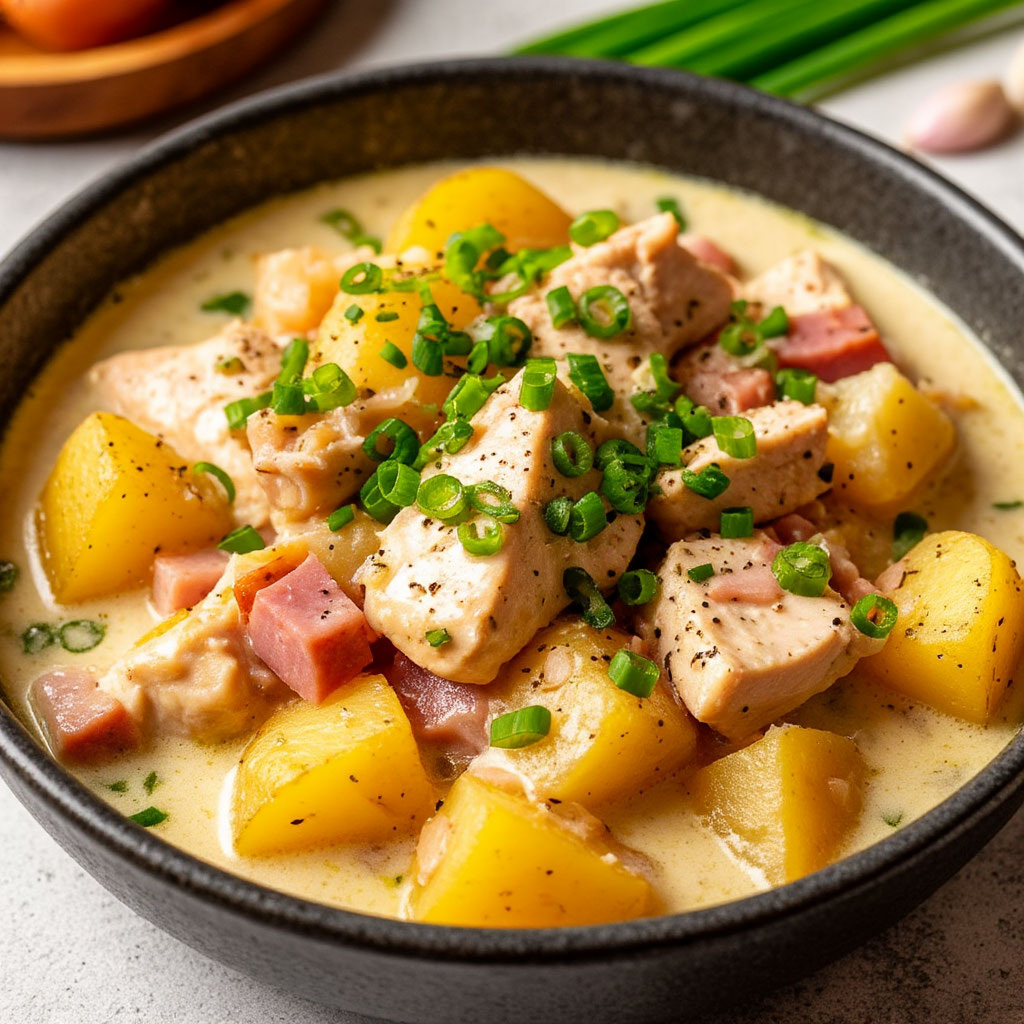 Тушеная картошка в сливочном соусе с курицей и ветчиной! Сытное и нежное блюдо!