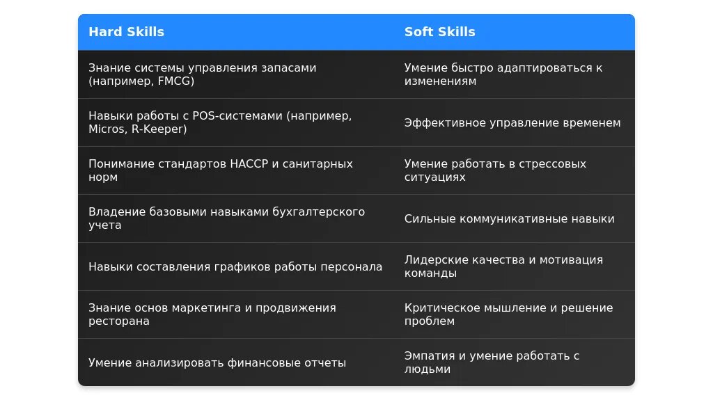 После адаптации: "Владение программами R-Keeper и iiko, управление персоналом, стрессоустойчивость, оптимизация процессов."