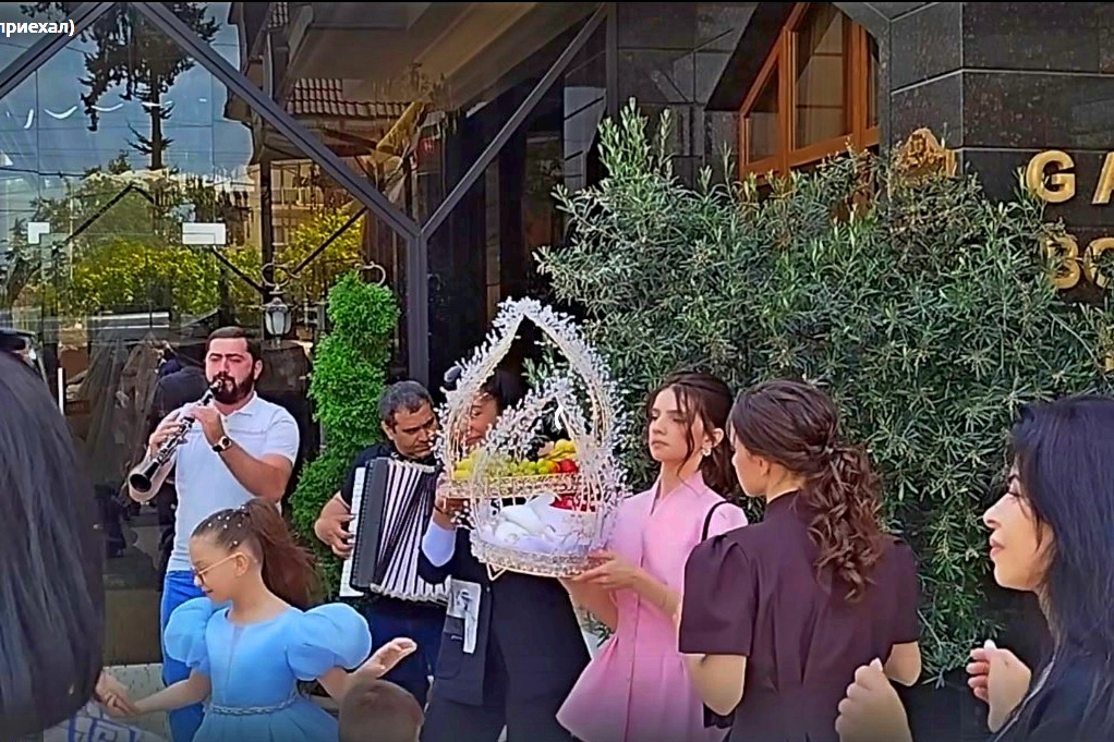 Родственники жениха, держа подносы над головой, танцуют во дворе невесты под веселую народную музыку – для этого специально приглашают