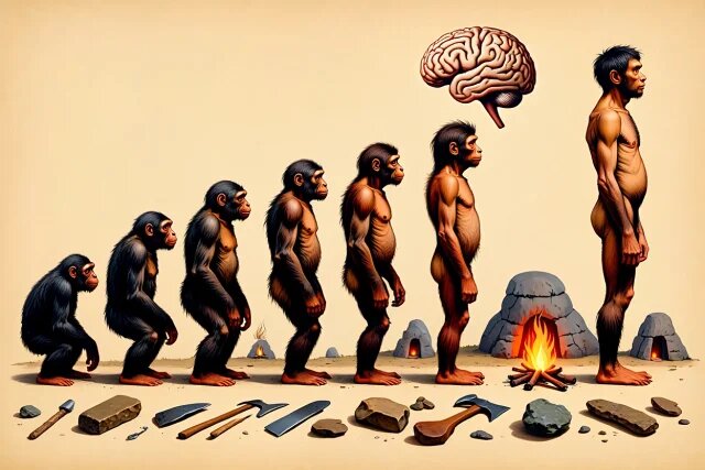 Эволюция — это медленный процесс изменений, где каждое поколение немного отличается от предыдущего. И так — десятки тысяч поколений. Примерная шкала: Неандертальцы были сильнее, выносливее, имели объём мозга даже больше, чем у нас.