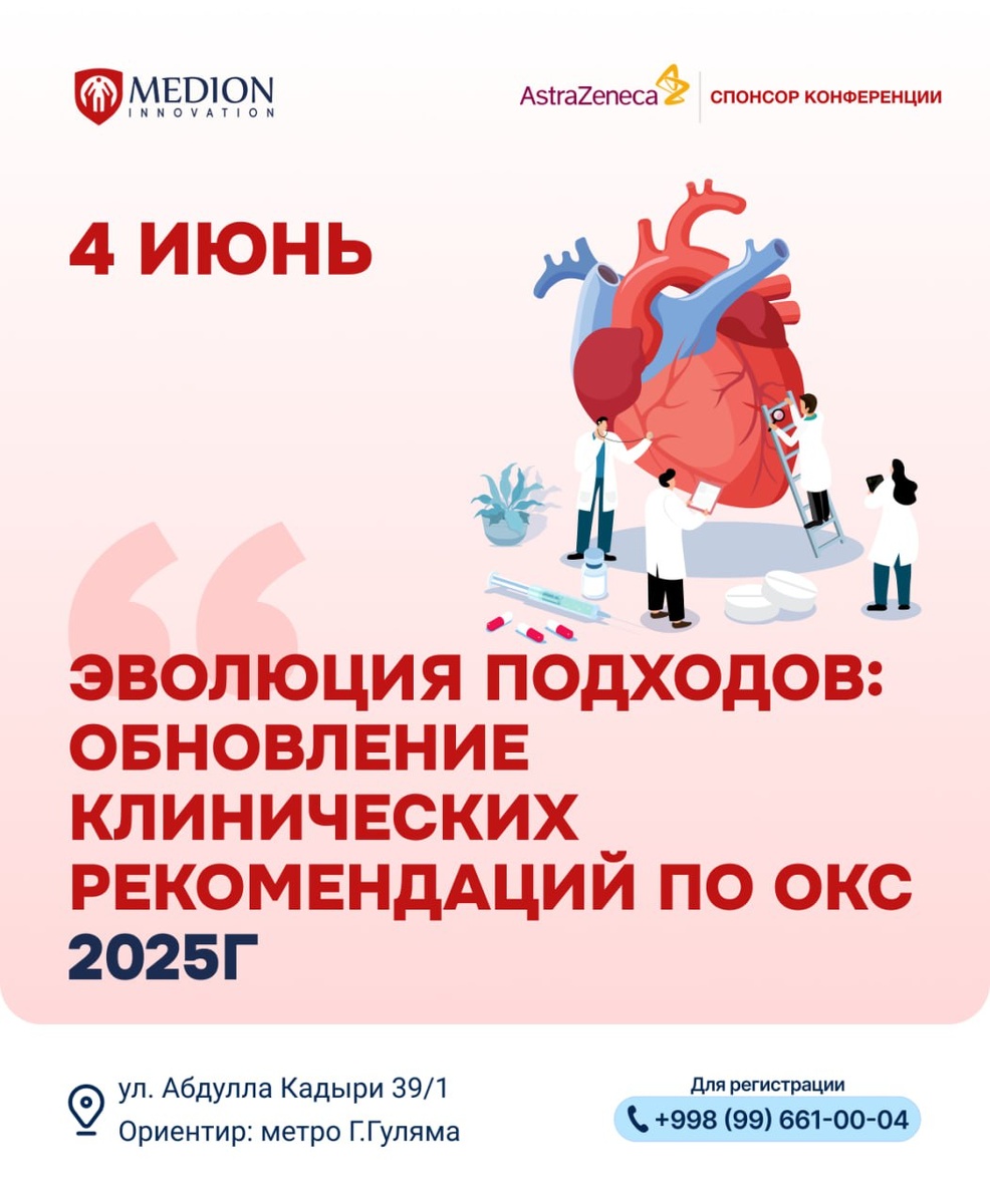 научно-практическая конференция «Новые акценты. Эволюция подходов: обновление клинических рекомендаций по ОКС — 2025» 🗓 Дата проведения: 4 июня 2025 года 🕒 Время начала: 14:00 📍 Место проведения: Medion Академия 💼 Спонсор мероприятия: AstraZeneca 🔷 Программа конференции 13:30 – 14:00 🔹 Регистрация участников 14:00 – 14:10 🔹 Приветственное слово Адилова Икбол Гафуритдиновна 14:10 – 14:50 🔹 Доклад: «Обновление клинических рекомендаций по ведению пациентов с острым коронарным синдромом: взгляд 2025 года» Абубакирова Ольга Александровна 14:50 – 15:10 ☕️ Кофе-брейк (возможность неформального общения и обмена мнениями) 🔖 Участие бесплатное. Предварительная регистрация обязательна. Количество мест ограничено. 📩 Для регистрации: 📞 +998 99 661 00 04