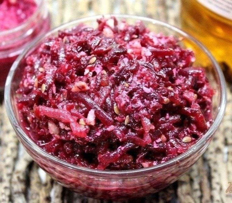 Вкусный и полезный салат из свеклы. Не зря его называют царским. Попробуйте и убедитесь. Даже если предвзято относится к свекле, то распробовав ложечку этого салата, вы точно измените свое мнение. Ингредиенты: - 1 шт свекла; - 1-2 шт соленых огурца; - горсть грецких орехов; - 1 ч. л семян льна; - 1 ч. л тертого хрена; - соль по вкусу; - 3 ст. л подсолнечного масла. Приготовление: Приготовление до 10 минут. Соленый огурец трем на крупной терке и высыпаем в миску. Свеклу отвариваем заранее. Затем, чистим, трем и добавляем к огурцу. Грецкие орехи можно натереть или наколоть. Измельченные орехи и семена льна добавляем в салат. Добавляем немного хрена для пикантности. Заправляем салат ароматным подсолнечным маслом (по желанию), добавляем соль. Перемешиваем и даём настояться не менее часа. Приятного вам угощения 🤗