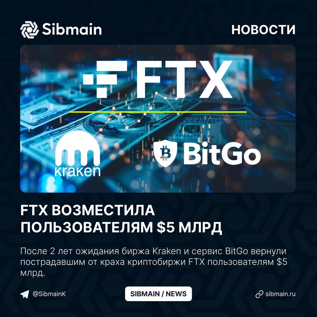 📰📰📰📰 ➡️FTX возместила пользователям $5 млрд После 2 лет ожидания биржа Kraken и сервис BitGo вернули пострадавшим от краха криптобиржи FTX пользователям $5 млрд. Компенсации получают: ⏺Институциональные клиенты ⏺Международные инвесторы ⏺Пользователи из США ⏺Клиенты с претензиями выше $50 000 Пользователи из 163 стран, включая Россию не получат возмещения из-за введенных ограничений работы с биржей Kraken и сервиом BitGo. 📍Выплата компенсаций от криптобиржи FTX в стейблкоинах сможет ускорить в июне рост первой криптовалюты или начать альтсезон. Sibmain комплексные решения для майнинга под ключ! - Поставки майнинг оборудования - Дата-центр в Красноярске 80 МВт - Размещение от 5 руб/кВтч ⌨️ Нужна консультация или помощь в подборе оборудования? Звоните: +7(800)351-14-70 📍 г. Москва Калужская площадь д.1 к.1 💬 WhatsApp 💬 @Sibmain_salesbot 🌐 sibmain.ru