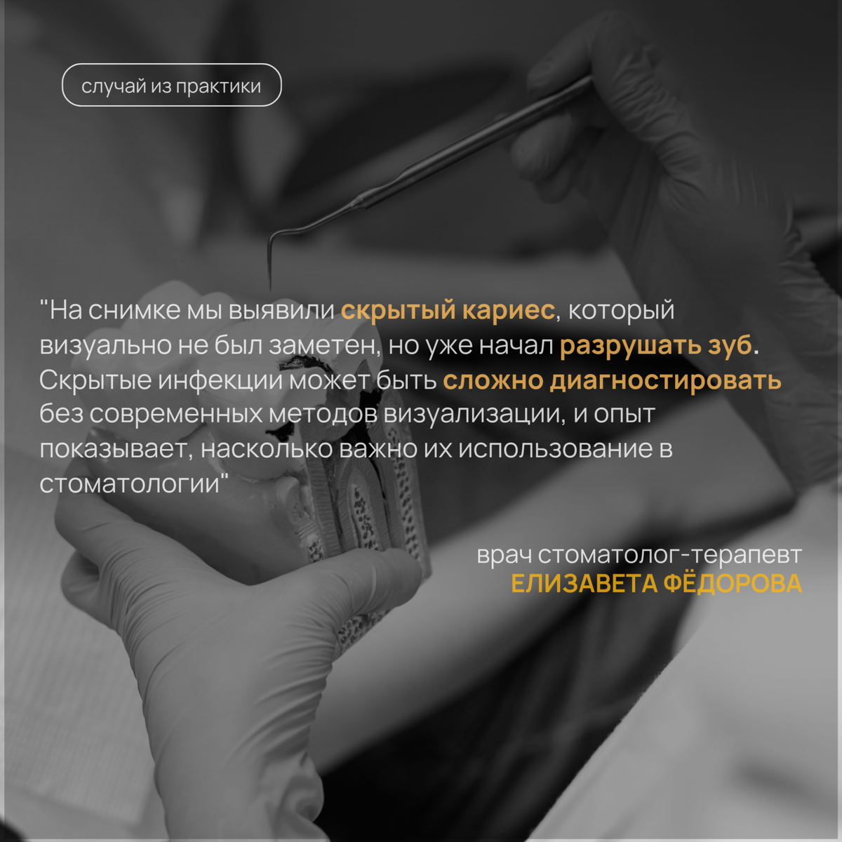 Как разрушаются наши зубы, или почему нужно обязательно посещать врача-стоматолога: история из практики врача-стоматолога Елизаветы Федоровой. 💬 «Недавно ко мне обратилась пациентка с целью плановой санации полости рта. Обычно такие визиты предполагают стандартные процедуры: осмотр, чистка и, при необходимости, лечение кариеса. Однако в нашем случае я решила сделать КТ для полноценной диагностики состояния зубов. Как оказалось, это решение оказалось крайне важным! На снимке мы выявили скрытый кариес, который визуально не был заметен, но уже начал разрушать зуб. Скрытые инфекции может быть сложно диагностировать без современных методов визуализации, и опыт показывает, насколько важно их использование в стоматологии. После получения результатов КТ я приступила к лечению. Кариозная полость зуба была тщательно обработана, и для восстановления использовался современный композитный материал Neo Spectra от Dentsply. Этот материал не только отлично подходит по цвету к естественным зубам, но и