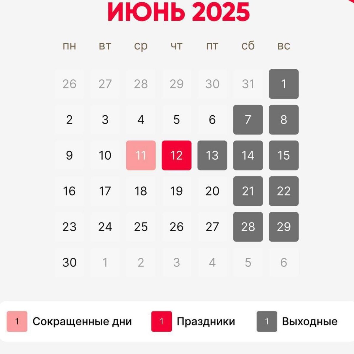 Рабочие и выходные дни в июне — смотрите в нашей инфографике.