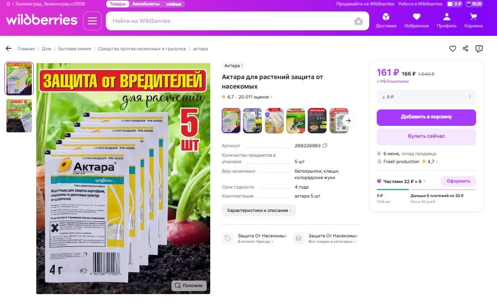 Покупать на Wildberries становится все опаснее и опаснее. Площадка совершенно не отслеживает продажи вредных и опасных товаров, причем демонстративно не реагирует на сообщения и отзывы покупателей. Собственно говоря, ей, площадке, это и не нужно. Главное, чтобы было много продавцов и много товаров. Я в очередной раз нарвался на грубую подделку. В этот раз мне "посчастливилось" купить поддельный инсектицид от компании Syngenta, а именно Актару. Актара - это системный инсектицид широкого действия третьего класса опасности (умеренно опасное соединение). Где купил: Витрина магазина, продающего подделки: Конечно, если читать отзывы, то сразу станет понятно, что этот товар 100% подделка и покупать его не стоит. И вообще лучше не доверять этому продавцу. Но, кто же читает отзывы? Основная опасность даже не в том, что нам продают какое-то непонятное средство и им можно навредить растениям. Я всё же полагаю, что присылают некое нейтральное средство. И дело не в том, что это просто выброшенные