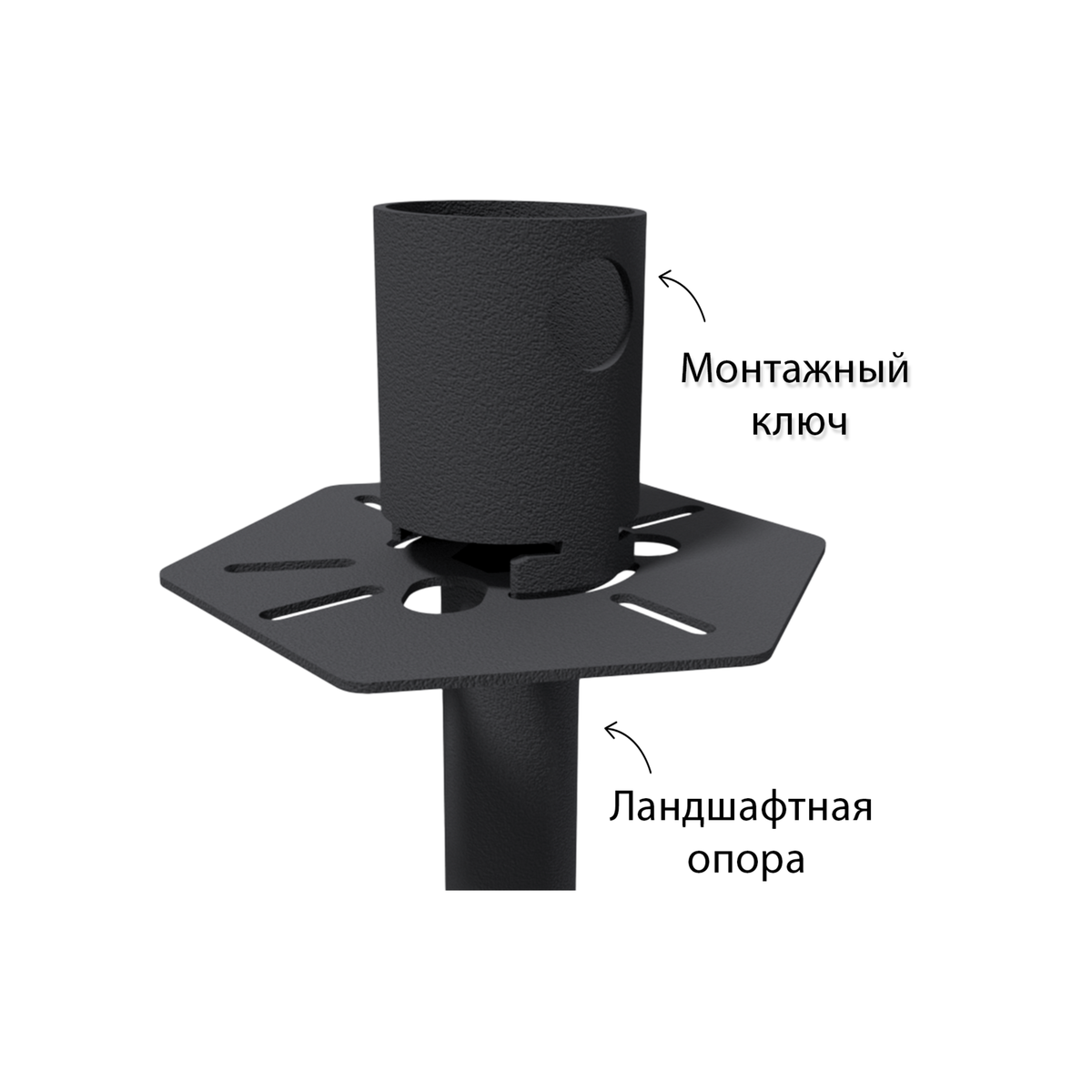 Одной из особенностей ландшафтной опоры является универсальный фланец, который обеспечивает возможность крепления садового светильника в двух, трех или четырех точках. Отверстия для крепления фонаря расположены на окружности. Это делает опору совместимой с разнообразными моделями ландшафтных светильников, включая
