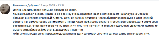 Хочу поделиться с вами, мои дорогие подписчики, личными итогами, достигнутыми в прошедшем 2024/2025 учебном году. 1. Сопровождение четвероклассника, находящегося на домашнем обучении, весь учебный год. Формат: 2 раза в неделю очные, 3 раза в неделю – онлайн. Результат: успешно поступил в школу и готов к обучению по классно-урочной системе. 2. Индивидуальные занятия по подготовке к предметным олимпиадам. Формат: 2 утренних занятия по воскресеньям с домашними заданиями. Результат: успешное выступление на олимпиадах разных уровней, дошел до II тура городской олимпиады. 3. Курсы олимпиадной математики, 3 и 4 классы. Формат: групповые занятия в мини-группах, занятия онлайн по воскресеньям. Результат: отрывки из отзывов родителей (см.ниже). 4. Индивидуальные занятия по подготовке к ВПР по русскому языку и математике. Формат: 1 раз в неделю по 30 или 40 минут на предмет. Результат: 4 и 5, независимо от уровня знаний до начала занятий. 5. Индивидуальные занятия по устранению незнаний, повышени