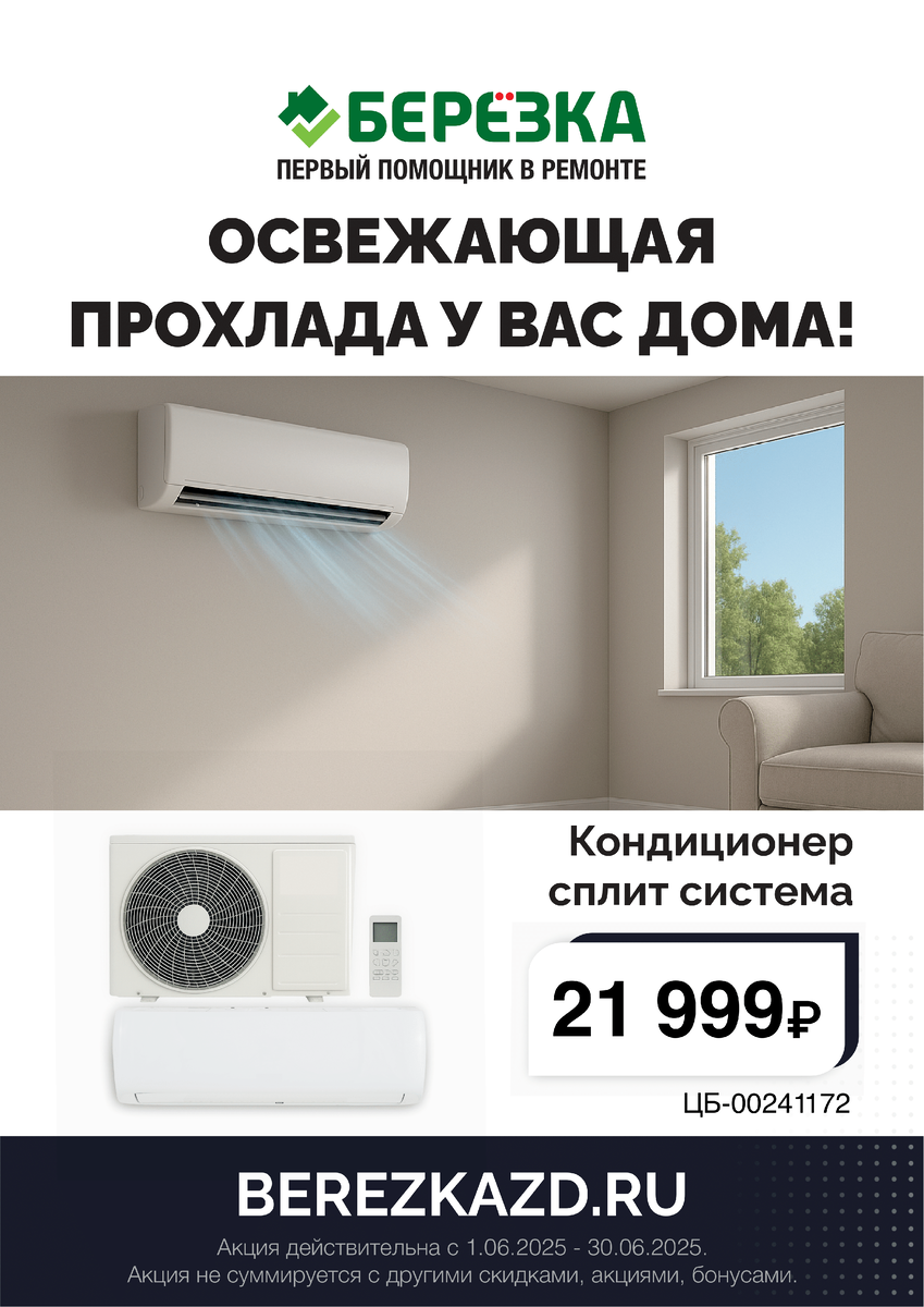 Лето только началось, а мы уже вспомнили и прочувствовали, что такое настоящая жара, многие успели задумались о покупке кондиционера. Кондиционер (сплит-система) — это отличный способ создать комфортный микроклимат в доме: при правильном выборе эффективно охлаждает летом и обогревает зимой. Как выбрать подходящую модель? Обратите внимание на следующие характеристики: Мощность определяется размером площади, на которую рассчитан кондиционер. В «Берёзке» консультанты помогут подобрать оптимальный вариант с учётом площади, количества комнат, типа дома и других факторов. Рекомендуем выбирать модели с классом A, A+ или A++, они потребляют меньше электроэнергии, соответственно экономнее. - Охлаждение и обогрев - Режим вентиляции без охлаждения - Таймер и режим сна - Фильтры с антибактериальным эффектом или HEPA-фильтры для чистого воздуха Для спален и рабочих комнат лучше выбирать модели с уровнем шума до 30 дБ — так будет комфортно и тихо. Стандарт — пульт дистанционного управле