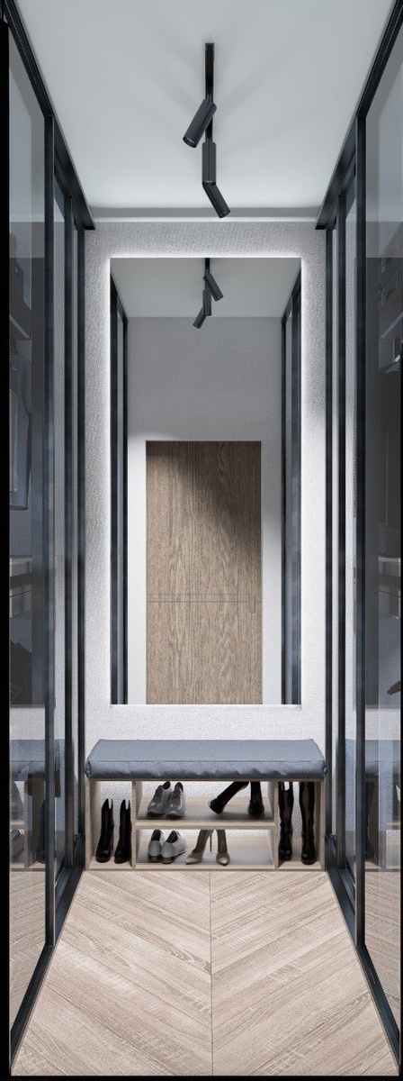 Гардеробная с подсветкой, стеклянными фасадами и удобной скамьёй. Всё на виду, всё по местам.