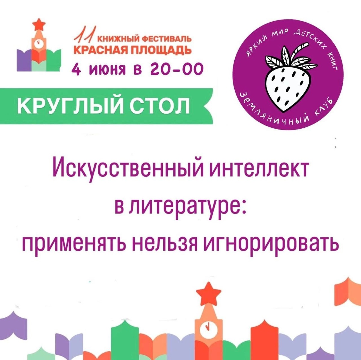 Друзья, уже завтра начнется главное книжное событие года — книжный фестиваль "Красная площадь". Книги и встречи, автограф-сессии и презентации новинок, стенды любимых издательств и выступления любимых авторов — все это традиционно ждёт гостей фестиваля 4 - 7 июня в самом сердце Москвы. Земляничный клуб проведёт в день открытия фестиваля круглый стол "Искусственный интеллект в литературе: применять нельзя игнорировать". Может ли искусственный интеллект создавать по-настоящему талантливые литературные произведения? Как изменится роль писателей и иллюстраторов в эпоху развития искусственного интеллекта? Этично ли использовать искусственный интеллект как соавтора? Как отличить настоящую литературу от созданную нейросетью?